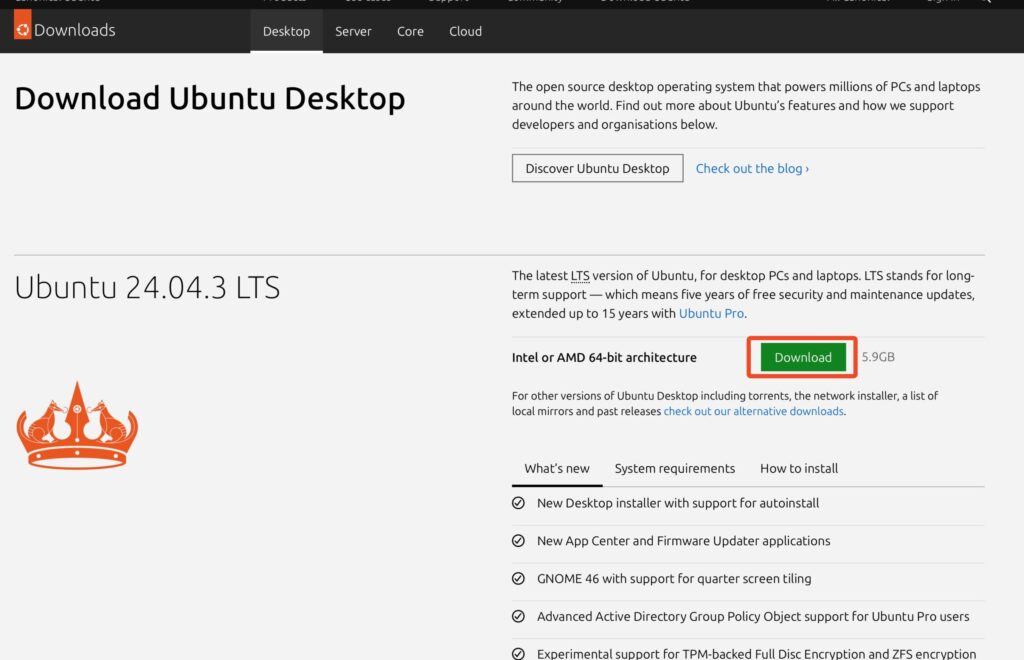 バージョンはインストールしたいものを選択すれば問題ありませんが、今回は25年11月時点の最新LTSバージョンである「Ubuntu 24.04.3 LTS」をダウンロードして進めていきます。