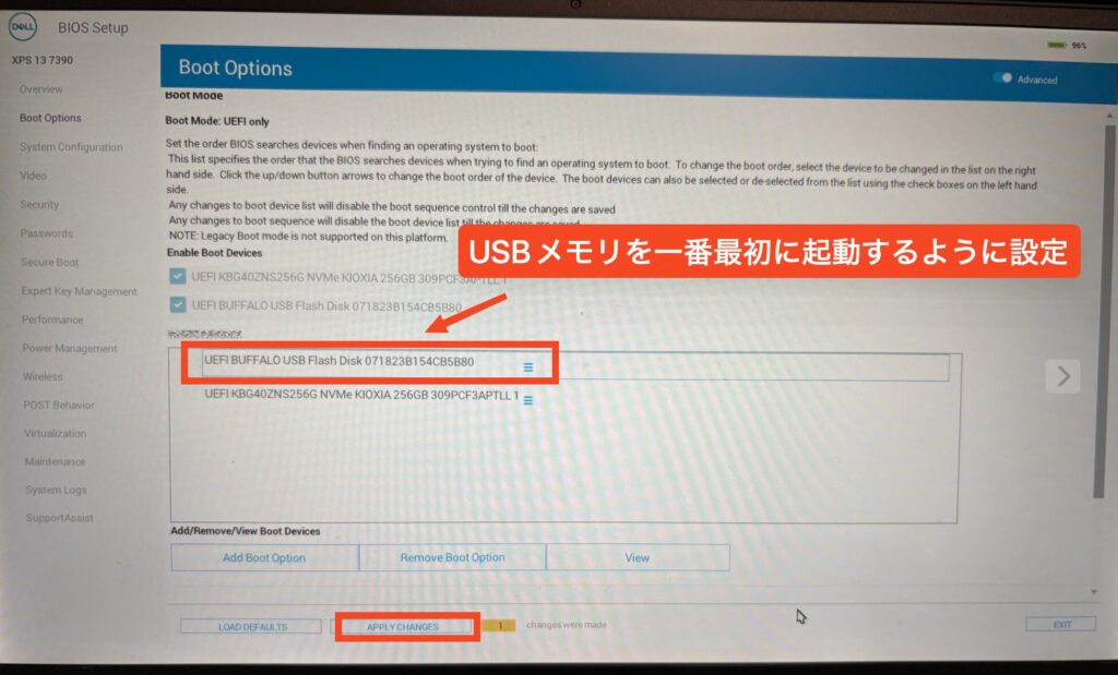 起動オプションの変更もPCによって異なりますが、起動順序の一番上に手順2で用意したUSBメモリを設定すれば問題ありません。