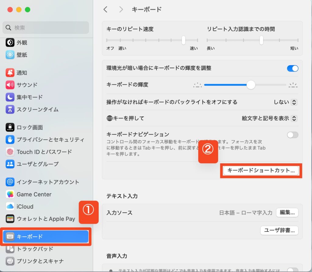 するとキーボードの設定画面が表示されるので「キーボードショートカット…」を選択してください(②)
