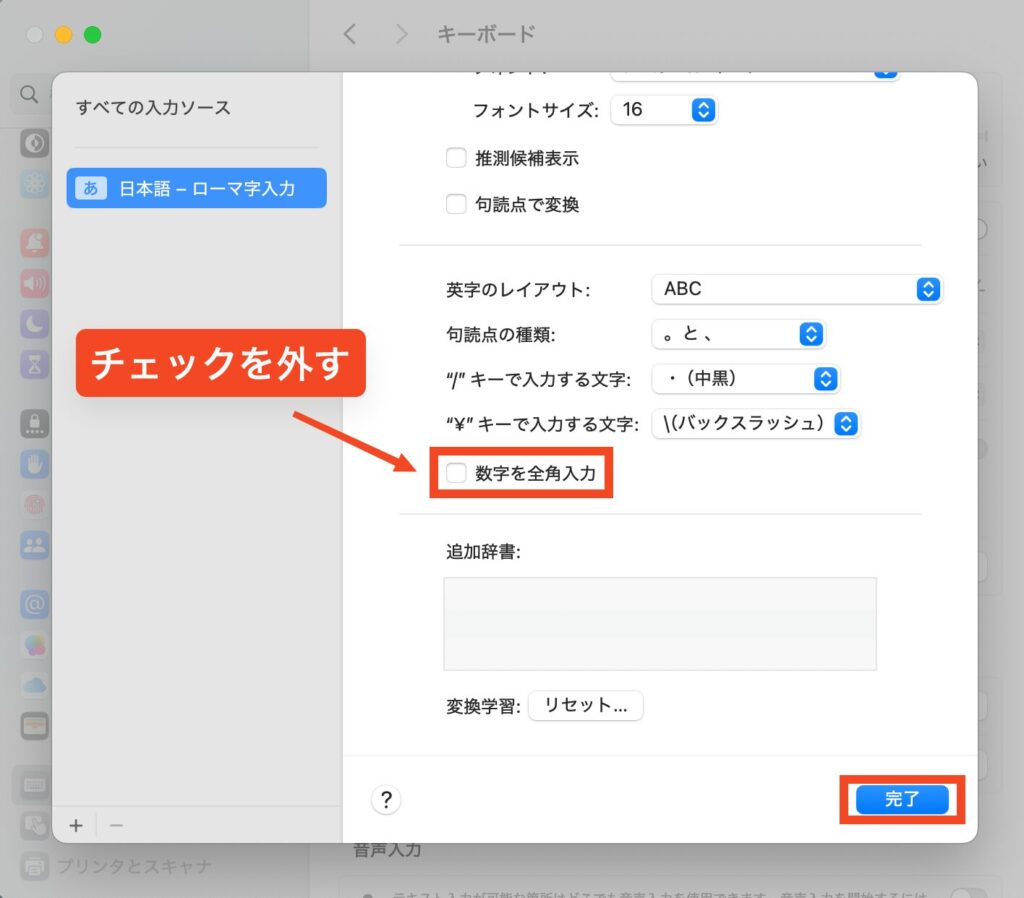 キーボードのショートカット設定画面が開いたら「日本語 – ローマ入力」の「数字を全角入力」のチェックを外せば作業完了です!